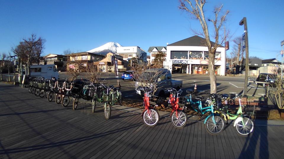 2026年1月12日7時55分現在2人乗りや電動アシスト等各種貸し自転車で山中湖一周してみませんか。サイクリングロードもありますので‼️09086416698までお気軽に問い合わせ下さい。各種貸し自転車と日本一の不二山さま。